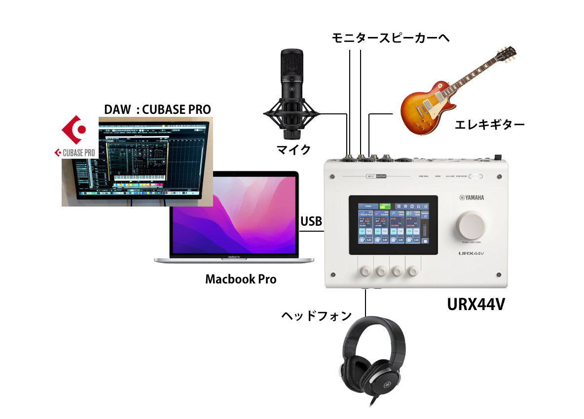 今回はCubaseを使った音楽制作をメインとするため、「DAW録音」の構成(MacbookとUSBで接続し、マイクやギターを入力、ヘッドフォンとスピーカーに出力)でセットアップを開始しました。